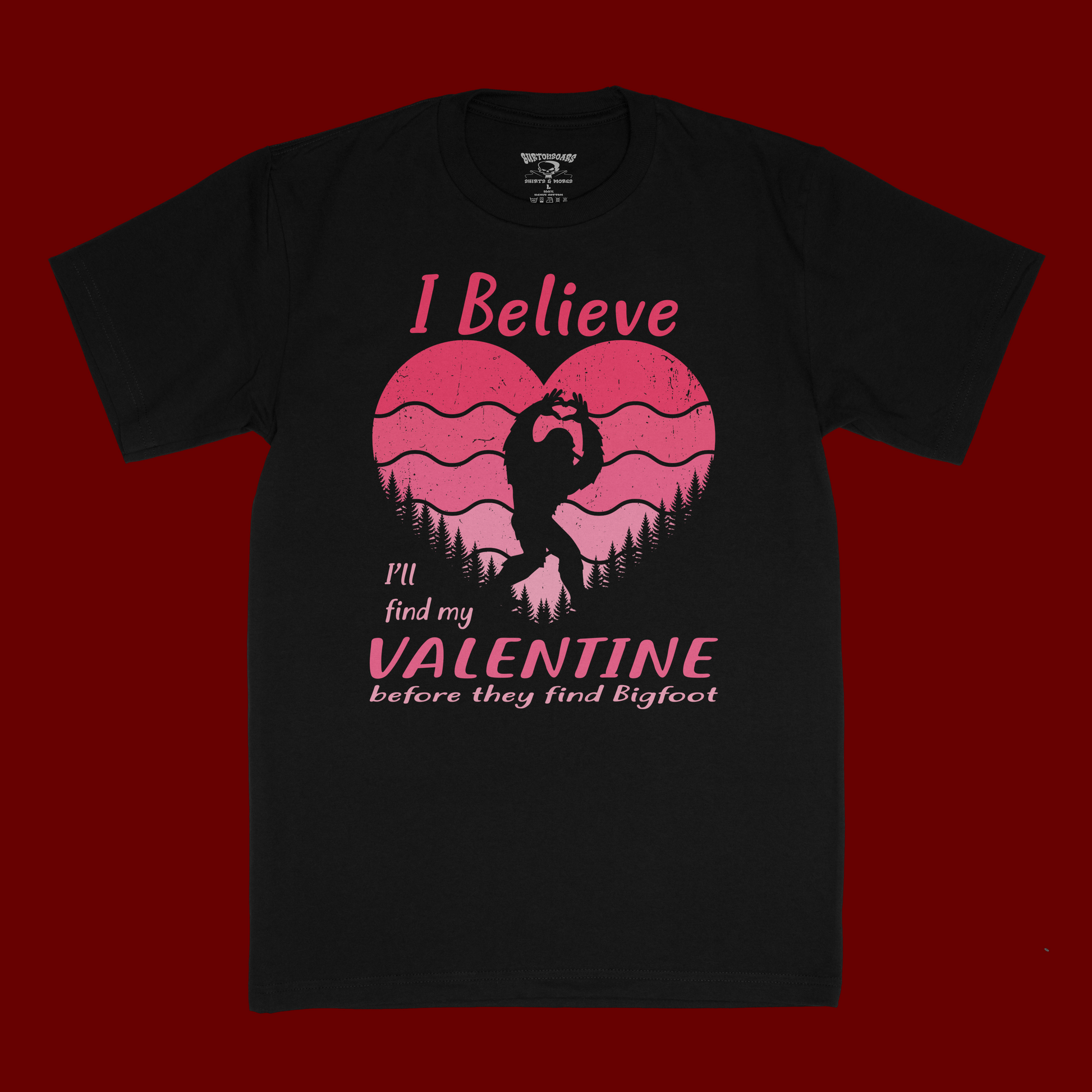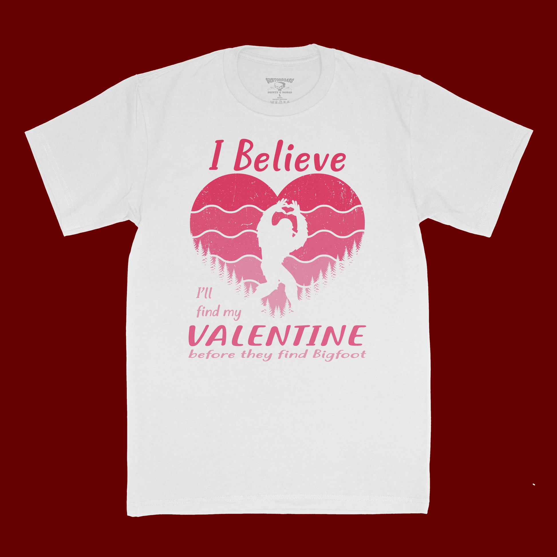 Spot your perfect match with this playful tee that celebrates the hunt for love. Crafted from 100% ring spun cotton in crisp white and black, it's soft, breathable, and built to last. The humorous "I Believe I'll find My Valentine before they find Bigfoot" design brings a lighthearted vibe to your wardrobe—ideal for anyone who appreciates witty humor and doesn't take romance too seriously. Comfortable enough for everyday wear, this shirt is a conversation starter that pairs perfectly with jeans or shorts.